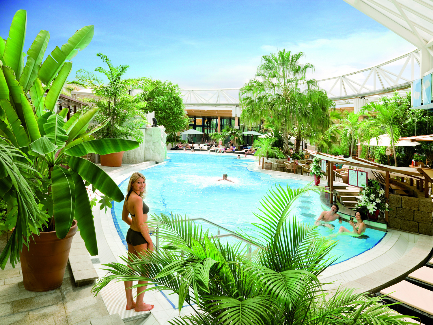 Enjoy the exotic holiday atmosphere and relax under real palm trees in the thermal suites or relax in the vital springs at the healing VitalOase.